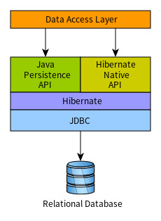 Jakarta Persistence 공급자로서 Hibernate는 Java Persistence API 사양을 구현하고, Jakarta Persistence 인터페이스와 하이버네이트 특정 구현 사이의 연결은 다음 다이어그램에서 시각화할 수 있습니다.