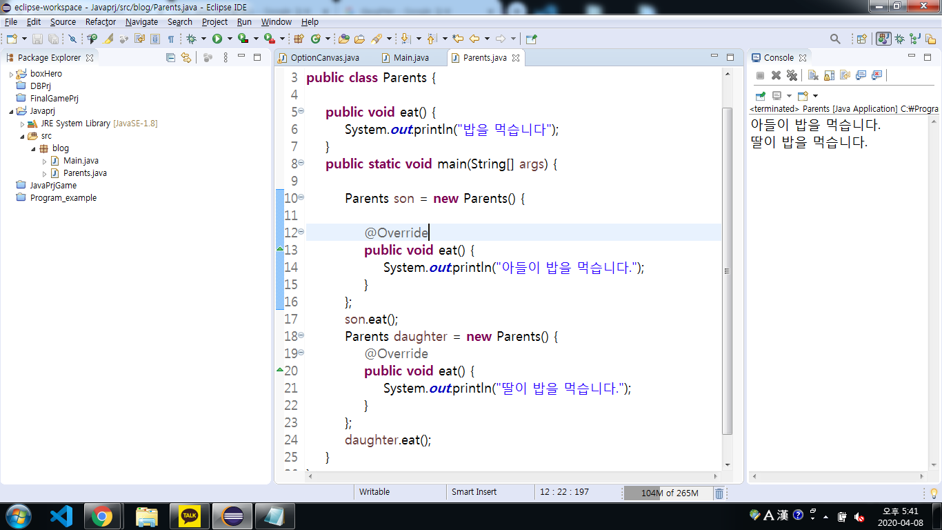 Parents의 eat() 메서드를 오버라이드 해서 밥을 먹을 수 있습니다.
