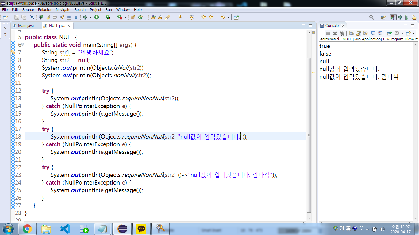 obj값이 null이면 NullPointerException(msg)을 발생