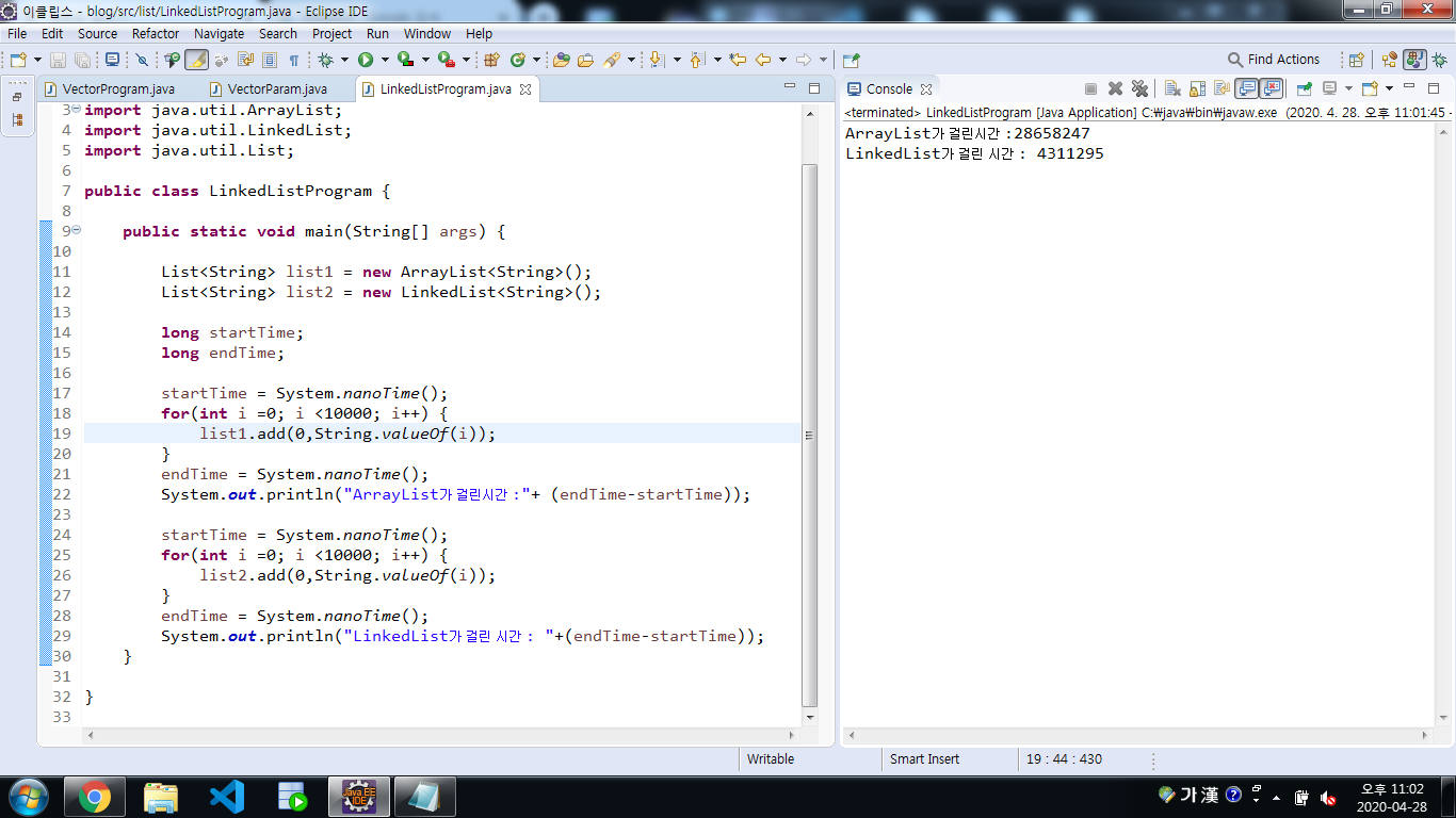 System.out.println("LinkedList가 걸린 시간 : "+(endTime-startTime));