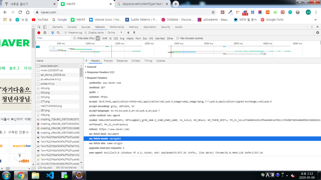 밑의 사진은 네이버 서버에 요청할 때 개발자 도구에서 볼 수 있는 화면입니다.
