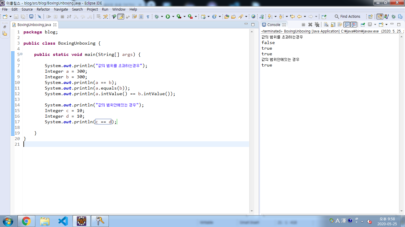 예외 : 다음 값이라면 포장객체로 == 과!= 연산자로 내부의 값을 비교할 수 있습니다.