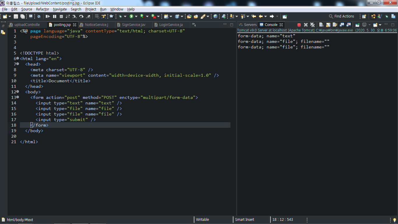 보통 우리는 form안에 텍스트와 파일을 같이 입력받는 경우가 많습니다. 이러한 경우 텍스트와 파일을 구분할 수 있는 기능은 part.requestHeader("Content-Dispostion")입니다.