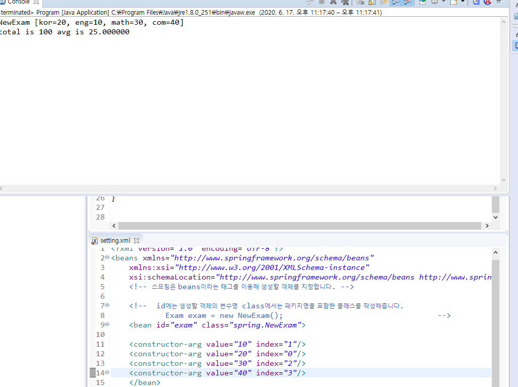 setting.xml의 <constructor-arg></constructor-arg> 태그를 이용해서도 값을 넣어줄 수 있습니다.
