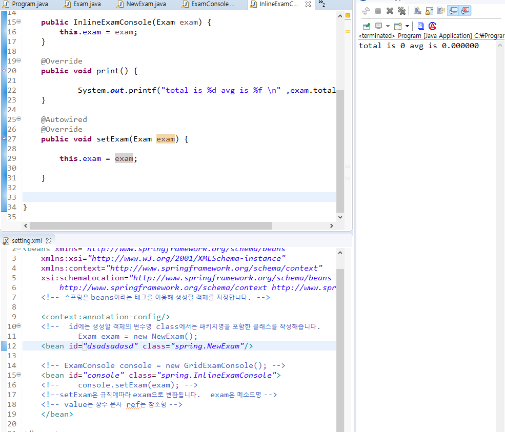 이것은 <property name="exam" ref="exam/> 코드의 내용을 이야기한 것이기 때문에