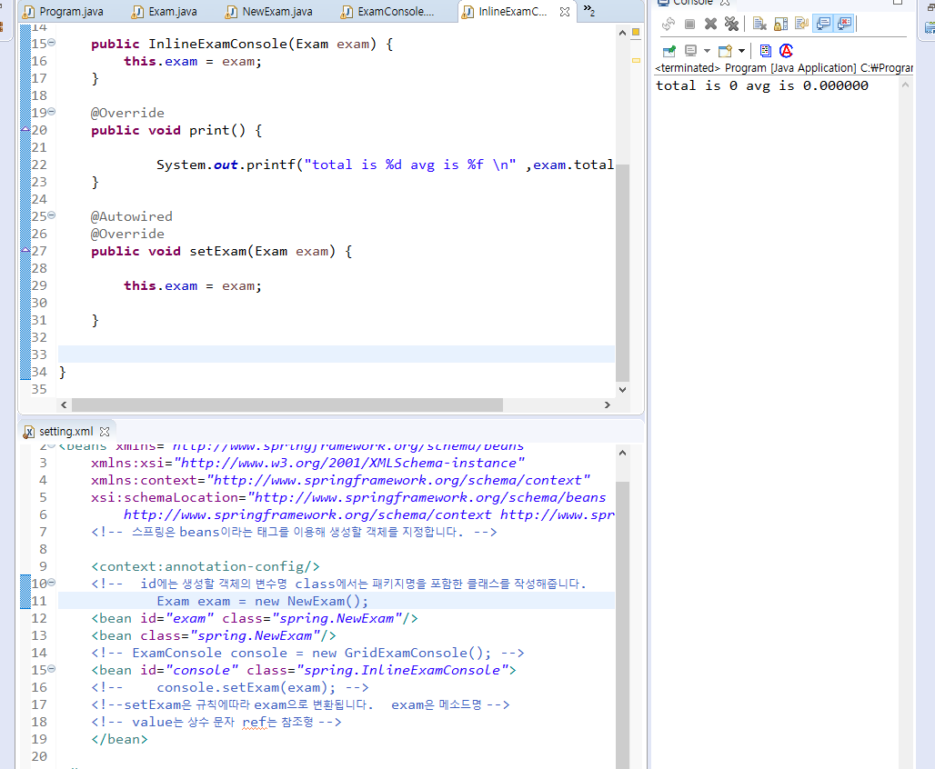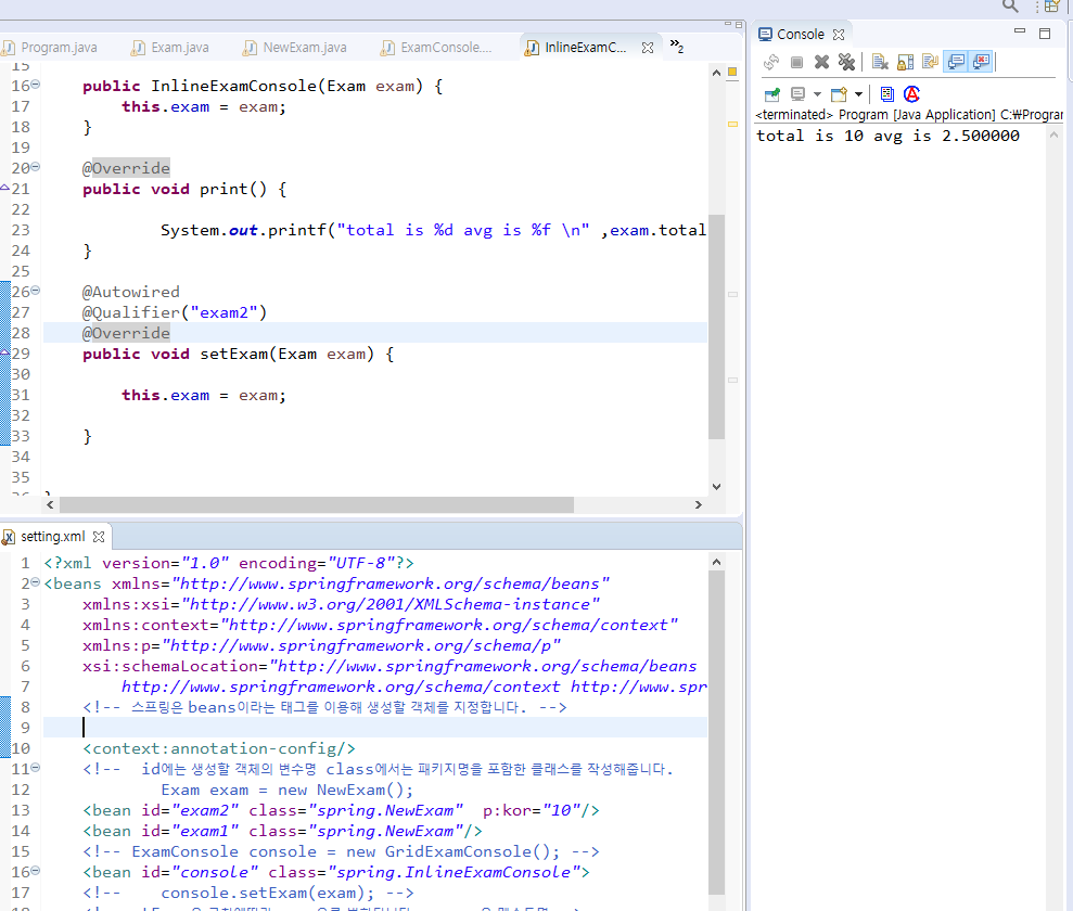 등록된 Bean 객체가 호출될 때 Exam형식을 참조할 수 있는 객체를 자동으로 찾아주고 바인딩을 해준다는 것입니다.
