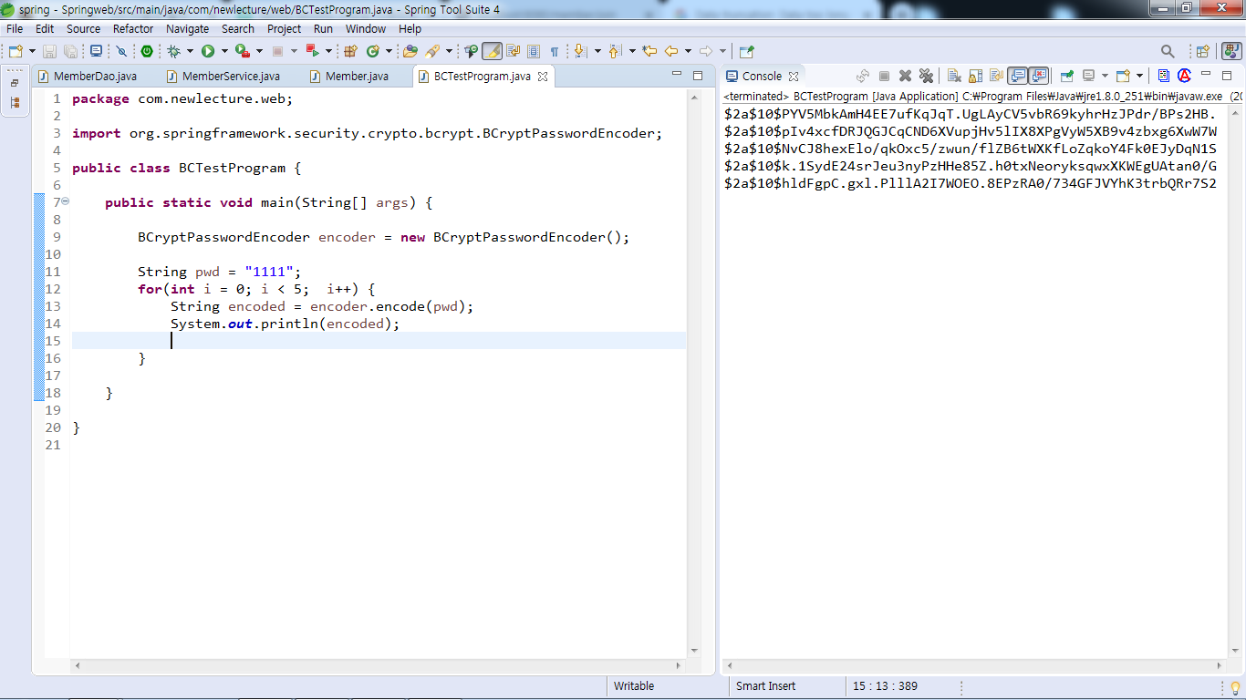 BCryptPasswordEncoder 인코더를 사용해 같은 문자열을 5번 출력한 경우