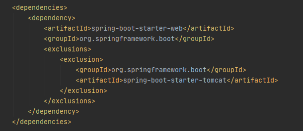 만약 내장 톰캣이 아닌 다른 내장 웹서버를 이용하기 위해서는 pom.xml의 설정값을 변경해주어야 합니다.