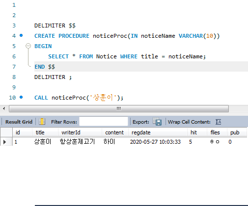 10행에서 Notice테이블의 title값을 입력 매개변수를 넘겨주어 프로시저에서 조건 처리가 가능하다.
