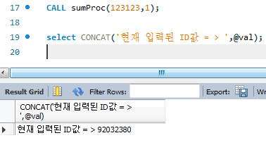 select CONCAT('현재 입력된 ID값 = > ',@val);