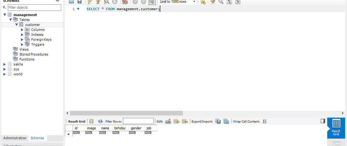 고객을 위한 데이터베이스를 생성합니다. table명은 management입니다.