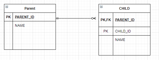 다른 말로 하면 CHILD테이블은 PARENT_ID를 기본 키 와 외래 키로 사용하며 CHILD_ID라는 기본 키를 가지고 있다.