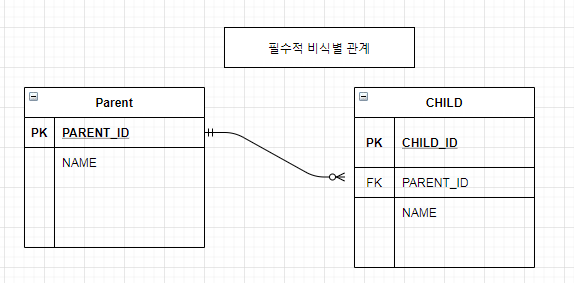 필수적 비식별 관계 : 외래 키에 NULL값을 허용하지 않는다. 연관관계를 필수적으로 맺어야 한다.