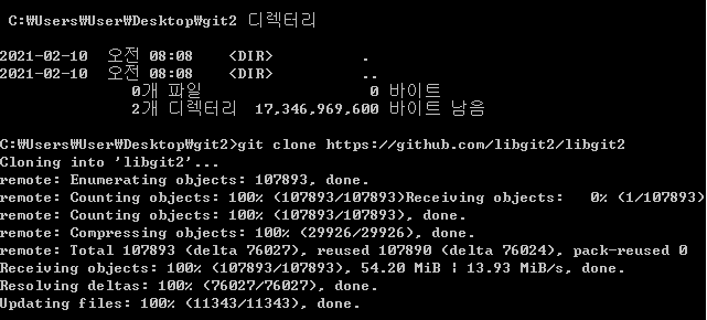 이 명령은 “libgit2”라는 디렉터리를 만들고 그 안에. git 만든다. 그리고 저장소의 데이터를 모두 가져와서 자동으로 가장 최신 버전을 Checkout 해 놓는다.
