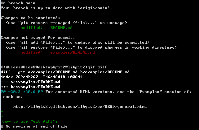 README파일을 Stage 한 후에 다시 수정해도 git diff를 사용할 수 있는데 이때는 staged 된 상태와 Unstaged 된 상태를 비교해 출력해 준다.