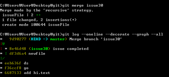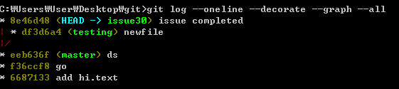 다음 로그를 보면 issue30브랜치는 앞으로 나아갔고 master브랜치는 가만히 있고 testing브랜치는 갈라졌다.