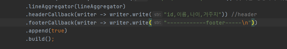 단순히 itemWriter에 append(true) 설정을 추가하고 푸터의 개행 문자를 추가해주어야 합니다 \n