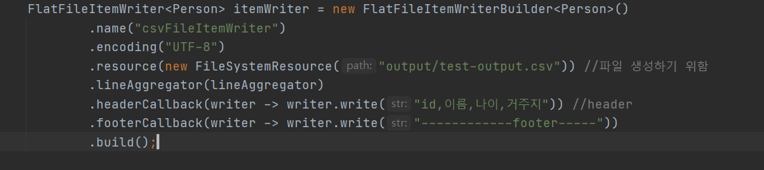 FlatFileItemWriter<Person> itemWriter = new FlatFileItemWriterBuilder<Person>()