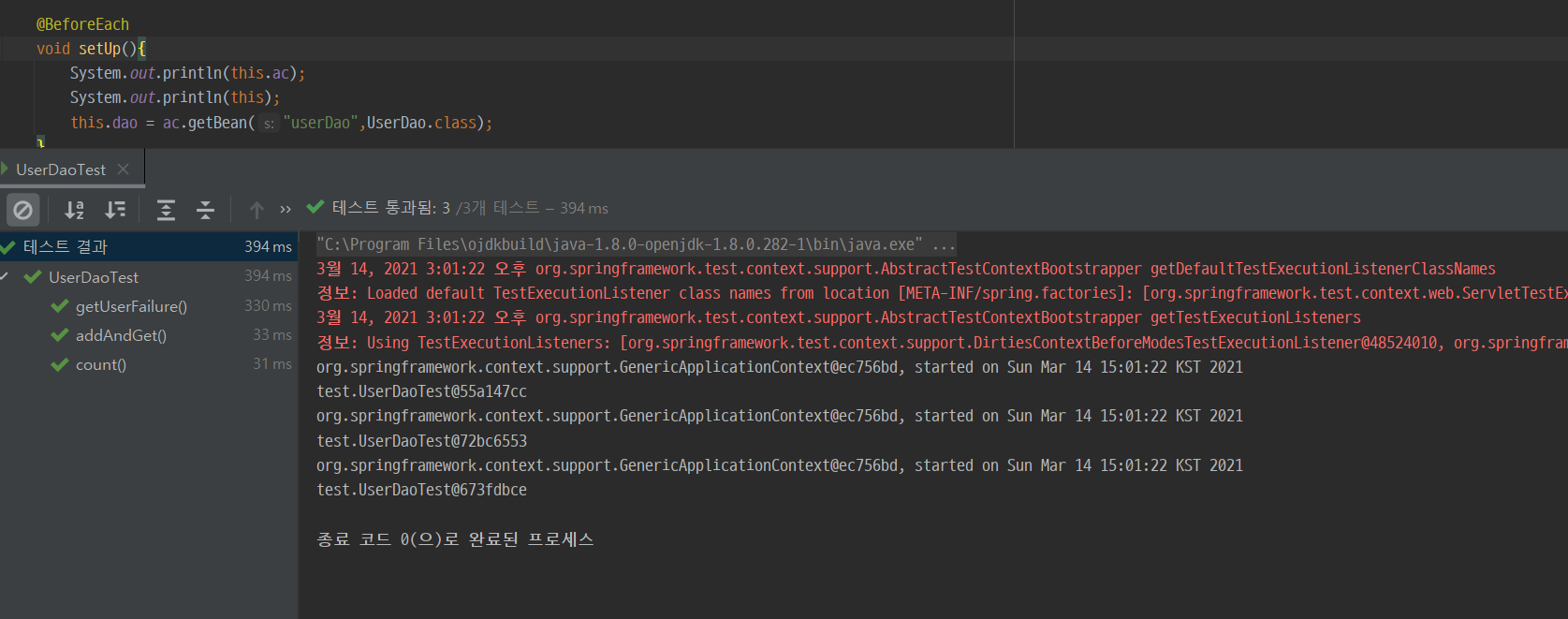JUnit5에 @BeforEach를 적용한 메서드에 다음과 같은 코드를 추가하고 실행해 보았다.