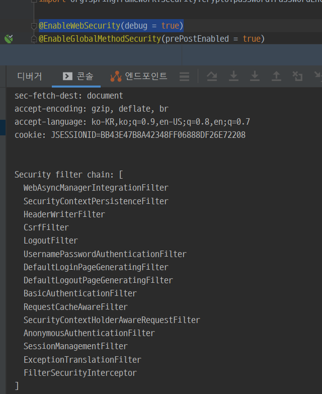 @EnableWebSecurity(debug = true)를 사용하면 다음과 같이 디버그 모드로 실행해서 요청이 올 때마다 적용된 필터 체인들을 볼 수 있습니다.