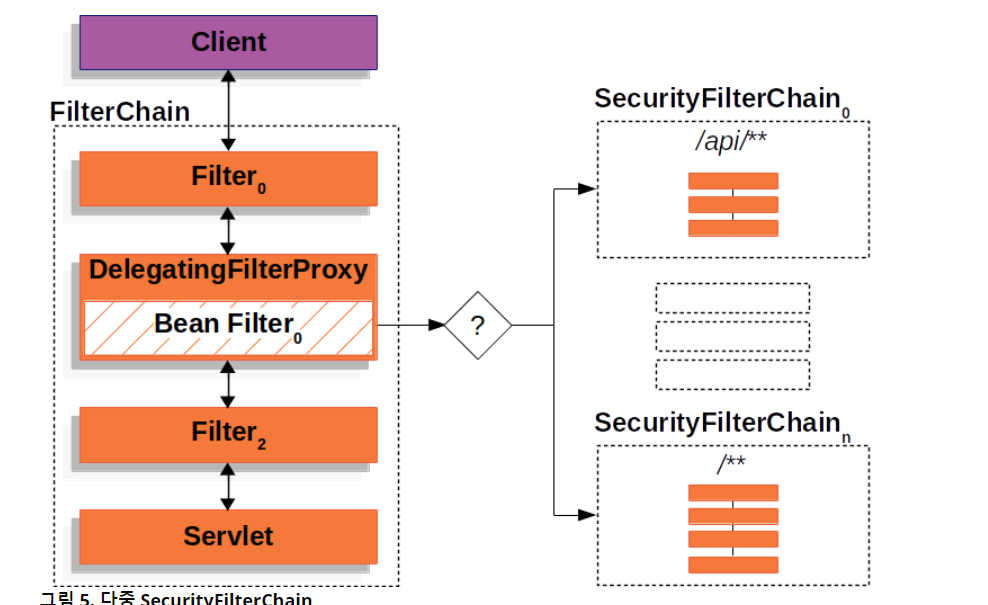 그래서 스프링 시큐리티는 DelegatingFilterProxy라는 필터를 만들어 메인 필터 체인에 끼워 넣고, 그 아래 다시 SecurityFilterChain 그룹을 등록합니다.