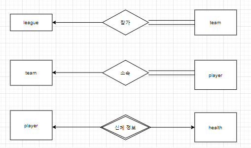 - 선수 (PK,:선수 이름, FK:팀이름, 포지션, 연봉, 입단 연도)