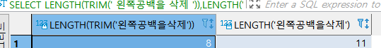 SELECT LENGTH(TRIM(' 왼쪽공백을 삭제 ')),LENGTH(' 왼쪽공백을 삭제 ') FROM DUAL;