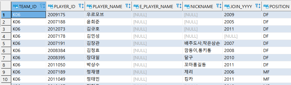 SELECT절에 명시한 플레이어의 생일을 기준으로 내림차순으로 정렬하겠다는 말인데, 2라는 정수로 간단히 표현했다. 하지만 가독성은 매우 떨어지니 사용하지 않고 ALIAS명이나 칼럼을 직접 명시하는 것이 좋다. 근데 왜 NULL값이 나왔는지 궁금하신 분들이 있다면, ORACLE에서는 NULL값을 가장 큰 값으로 취급한다. 데이터베이스마다 NULL의 크기를 취급하는 게 다르기 때문에 벤더별 확인을 하고 사용하는 것이 좋다.