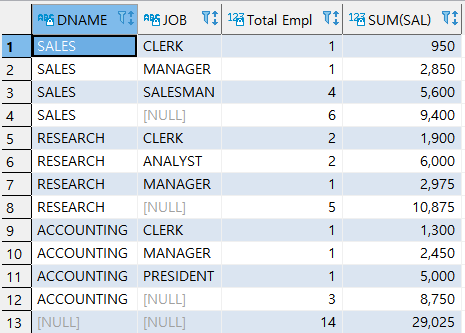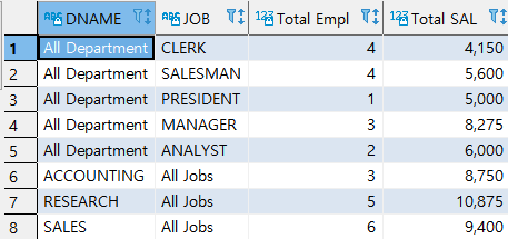 SELECT DNAME,GROUPING(DNAME),JOB,GROUPING(JOB), COUNT(*) "Total Empl",SUM(SAL) FROM EMP e ,DEPT d WHERE e.DEPTNO = d.DEPTNO