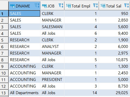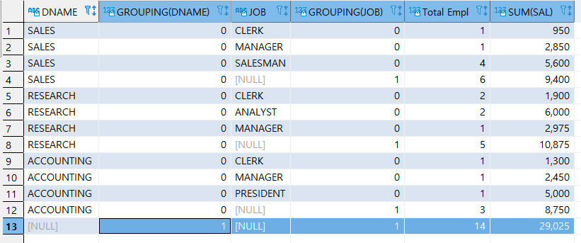결과를 보면 JOB기준으로 소계가 작성되었을 때 GROUPING(JOB) 칼럼에 1을 확인할 수 있고 마지막 소계에는 (DNAME, JOB) 전부 1이 들어가 있는 것을 확인할 수 있다.