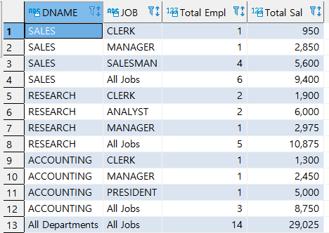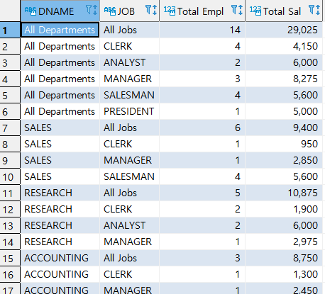 GROUP BY GROUPING SETS (DNAME,JOB);