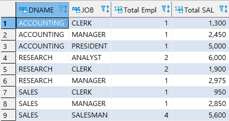 SELECT DNAME, JOB, COUNT(*) "Total Empl",SUM(SAL) "Total Sal"FROM EMP,DEPT WHERE EMP.DEPTNO =DEPT.DEPTNO GROUP BY DNAME,JOB