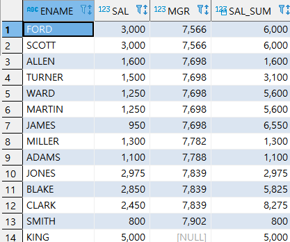 SELECT ENAME, SAL, MGR ,SUM(SAL) OVER (PARTITION BY MGR ORDER BY SAL DESC) "SAL_SUM" FROM EMP e;