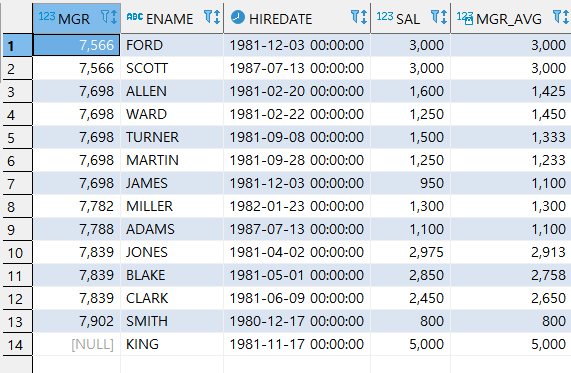 ROUND(AVG(SAL) OVER(PARTITION BY MGR ORDER BY HIREDATE ROWS BETWEEN 1 PRECEDING AND 1 FOLLOWING)) AS MGR_AVG