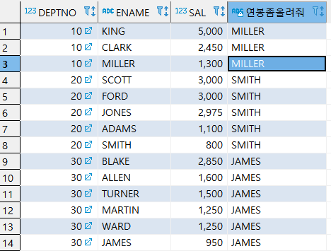파티션을 부서별로 나누었으며 해당 부서에서 연봉이 높은 순으로 정렬했기 때문에 마지막에 나온 값은 가장 연봉이 낮은 사원이다. 인자로 ENAME을 넘겼기 때문에 해당 칼럼마다 ENAME을 출력해 연봉이 낮은 사람을 두 번 죽이는 효과가 있다. 연봉 좀 더 줘라..