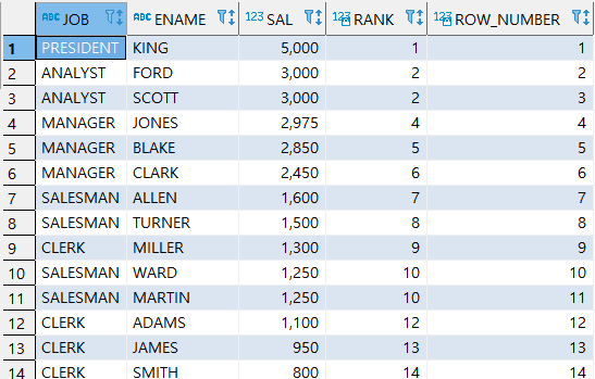 SELECT JOB, ENAME, SAL, RANK()OVER(ORDER BY SAL DESC) "RANK",ROW_NUMBER()OVER(ORDER BY SAL DESC) "ROW_NUMBER" FROM EMP;