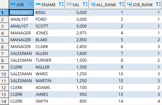 SELECT JOB,ENAME,SAL,RANK() OVER (ORDER BY SAL DESC) ALL_RANK, RANK() OVER (PARTITION BY JOB ORDER BY SAL DESC) JOB_RANK FROM EMP;
