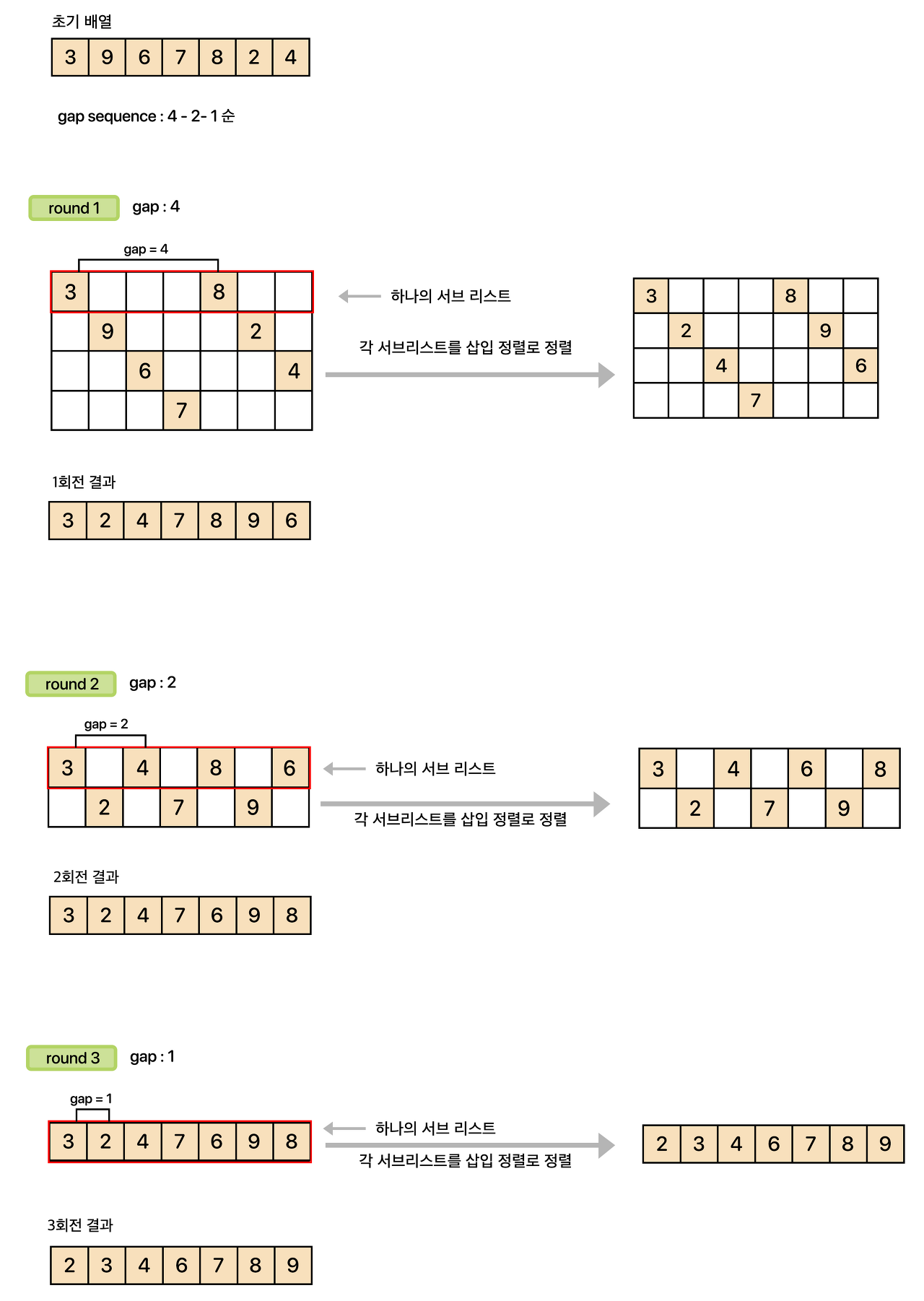 셸 정렬의 전체적인 과정은 다음과 같다.