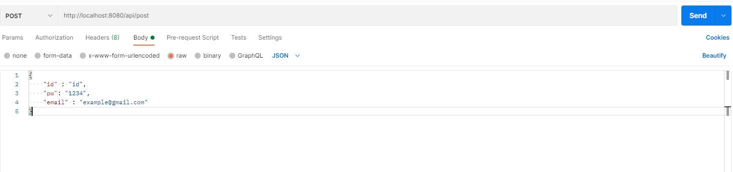 또한 return 값으로 객체가 반환되는 경우 JSON으로 변환된다. 그럼 JSON형식으로 요청을 보내고 RETURN값을 확인해 본다.