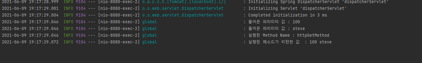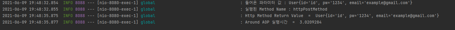 이제 실행되는 메서드의 이름과 입력받은 파라미터, 리턴한 값을 로그로 찍어보자.