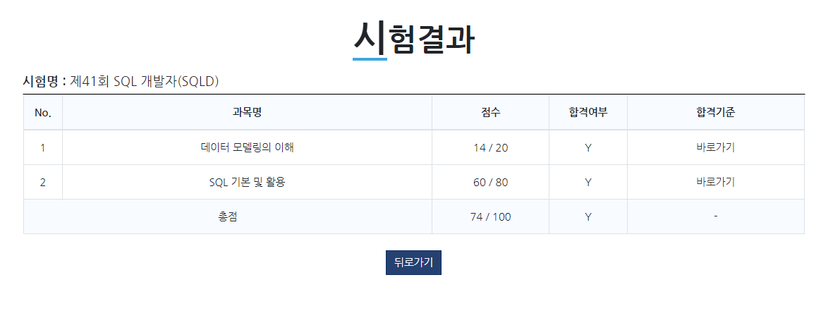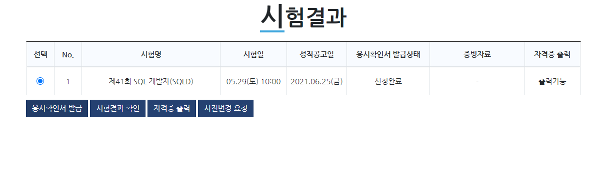 5월 29일 토요일에 있던 SQLD 시험을 보고 한 달 정도가 지난 26일 까먹고 있다가 일정 메모를 보고 황급히 데이터 자격시험 홈페이지에 들어가서 합격여부를 확인했다.