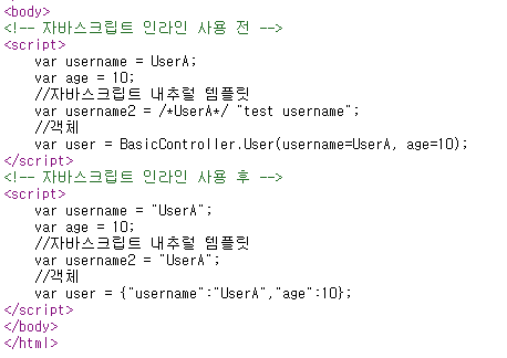 자바스크립트 인라인 사용 전에는 자바스크립트 문법이 틀려 실행되지 않는다. 문자열은 ", ' 로 감싸주어야 하고, 내추럴 템플릿으로 실행할 수 없으며, 유저 객체는 toString이 찍힌다. 이러한 다양한 문제를 해결하기 위해 toString을 재정의하고, 쿼테이션을 생성해 문자열인 경우에는 붙여주고 숫자인 경우는 그냥 찍도록 분기하는 이러한 모든 코드를 작성하는 것은 많은 시간과 노력이 들어간다.