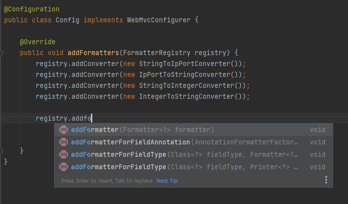 Converter를 등록하려고 보면 사용하는 interface를 보면 FormatterRegistry 타입을 통해 등록한다.