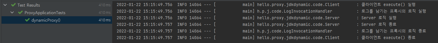 LogInvationHandler의 내부 로직을 수행하고 method.invoke(target, args)를 호출해서 실제 객체인 Server의 call()을 호출한다.@Override public Object invoke(Object proxy, Method method, Object[] args) throws Throwable { log.info("로그를 남기는 프록시의 로직 실행"); Object result = method.invoke(target, args); log.info("로그를 남기는 프록시의 로직 종료"); return result; } - 실 구현체인 Server의 call()이 실행되고 리턴된다.