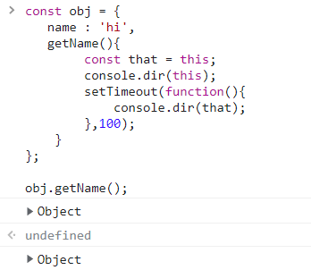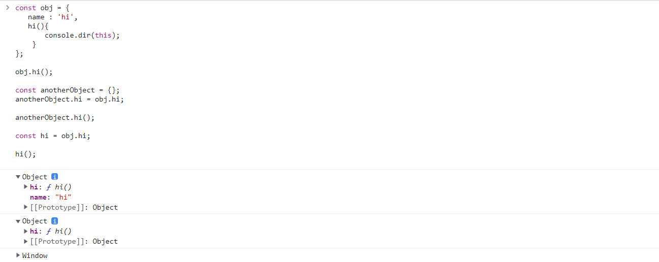 이는 obj객체의 hi() 메서드를 가리키는 함수 객체가 별도로 존재하여 값을 할당할 수 있는 모든 위치에 들어갈 수 있음을 뜻하며, 해당 this가 호출한 객체에 바인딩된다는 것을 알 수 있다.