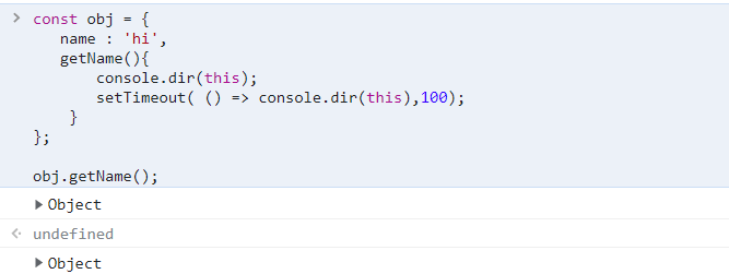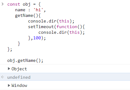 반면 setTimeout의 첫 번째 인자로 콜백 함수를 지정한 수 this를 호출했는데 Window객체 (전역 객체)가 출력된 것을 확인할 수 있다.