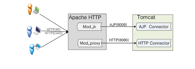 Apache가 AJP를 통해 Tomcat과 통신하도록 하려면 몇 가지 옵션이 필요한데 mod_jk 모듈, mod_proxy_ajp 모듈이 있습니다.