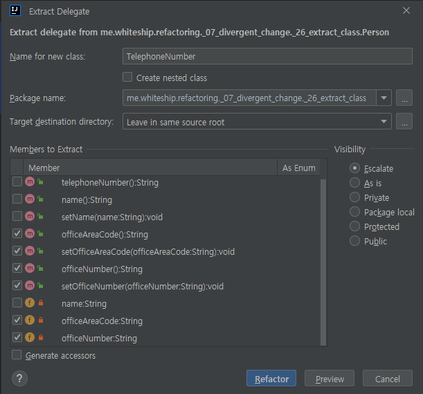 인텔리제이의 도움을 받아 Delegate으로 진행하면 위와 같이 코드가 만들어진다. 이후에 사용되지 않는 메서드를 지우는 작업과 기존 코드의 모양을 확인해서 의도한 대로 변경됐는지 확인해야 한다.