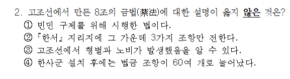 정답은 4번으로 한사군 설치와 8조 금법의 연관관계는 없어 보인다.