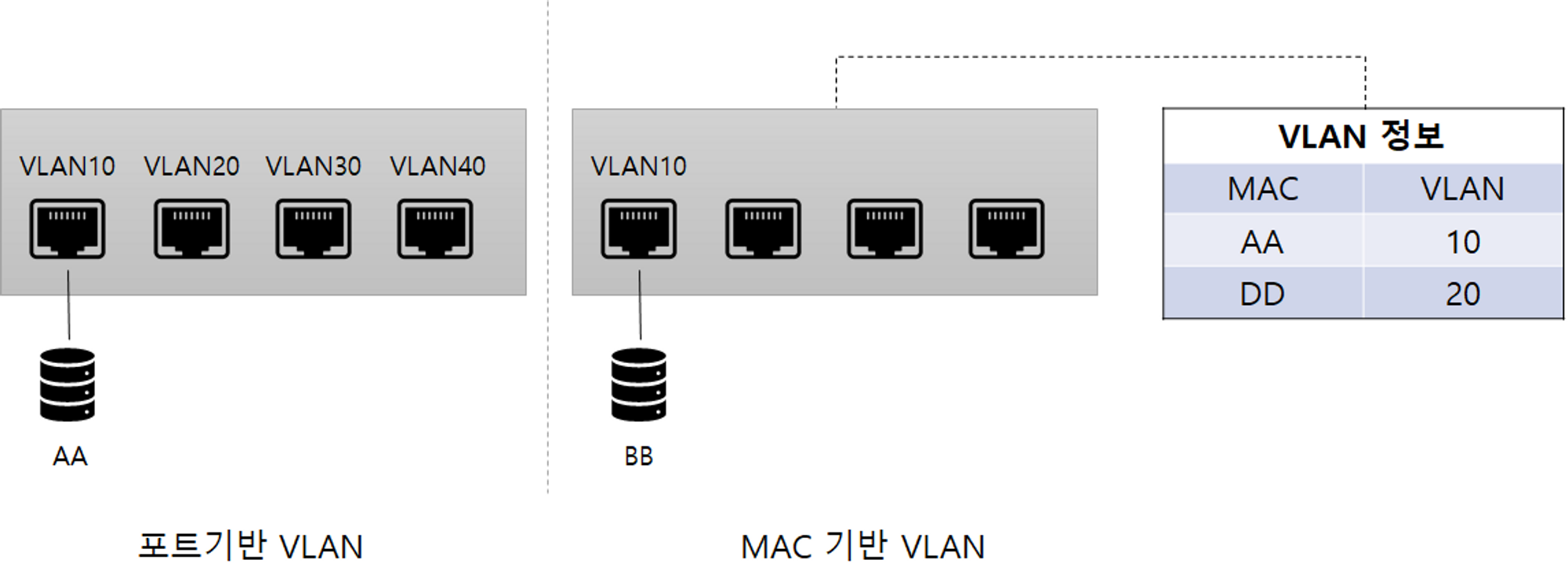 VLAN을 할당하는 방식에는 포트 기반의 VLAN과 MAC 주소 기반의 VLAN이 있습니다.